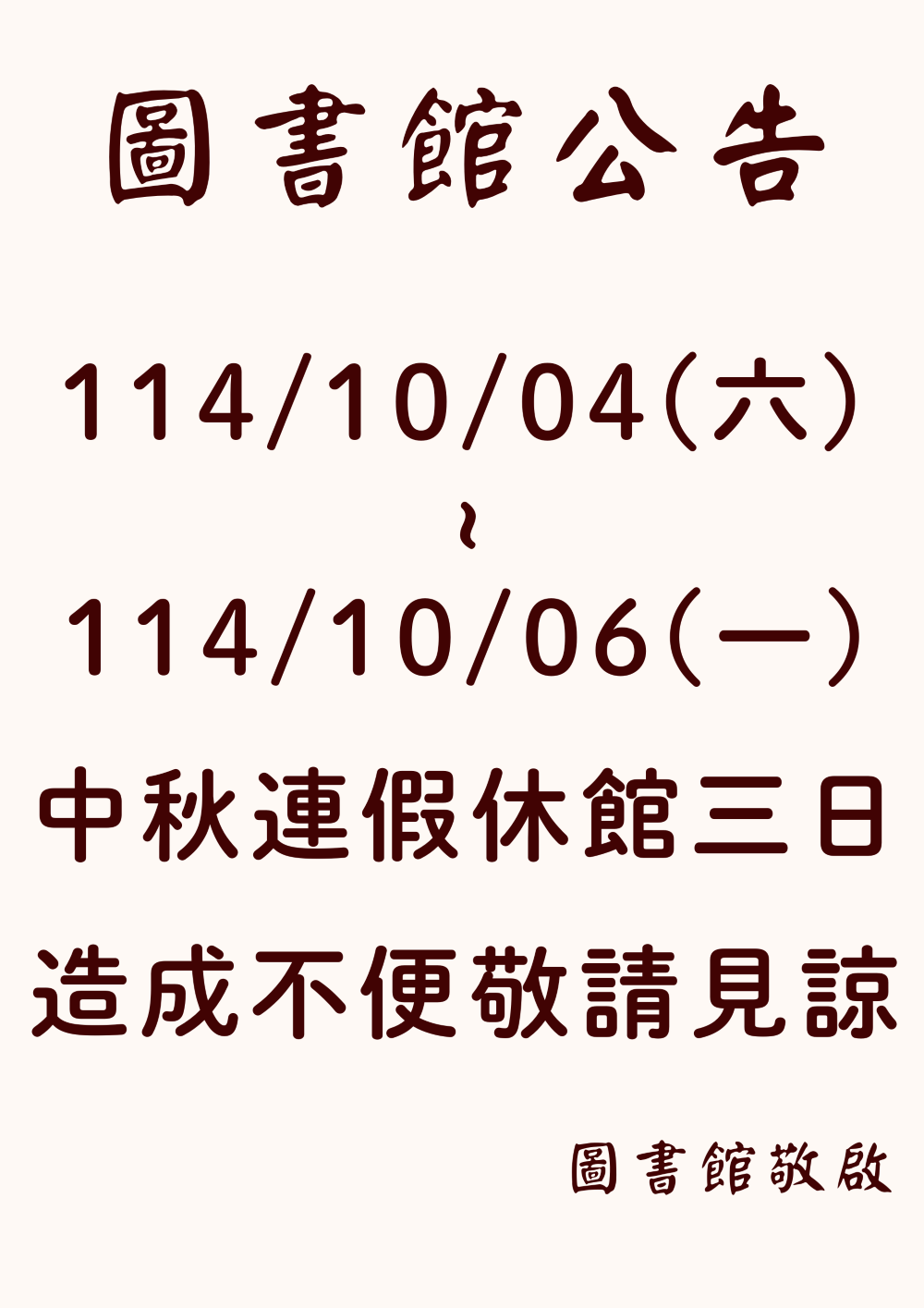 [圖資處公告] 10/4-10/6中秋節連假圖書館休館公告