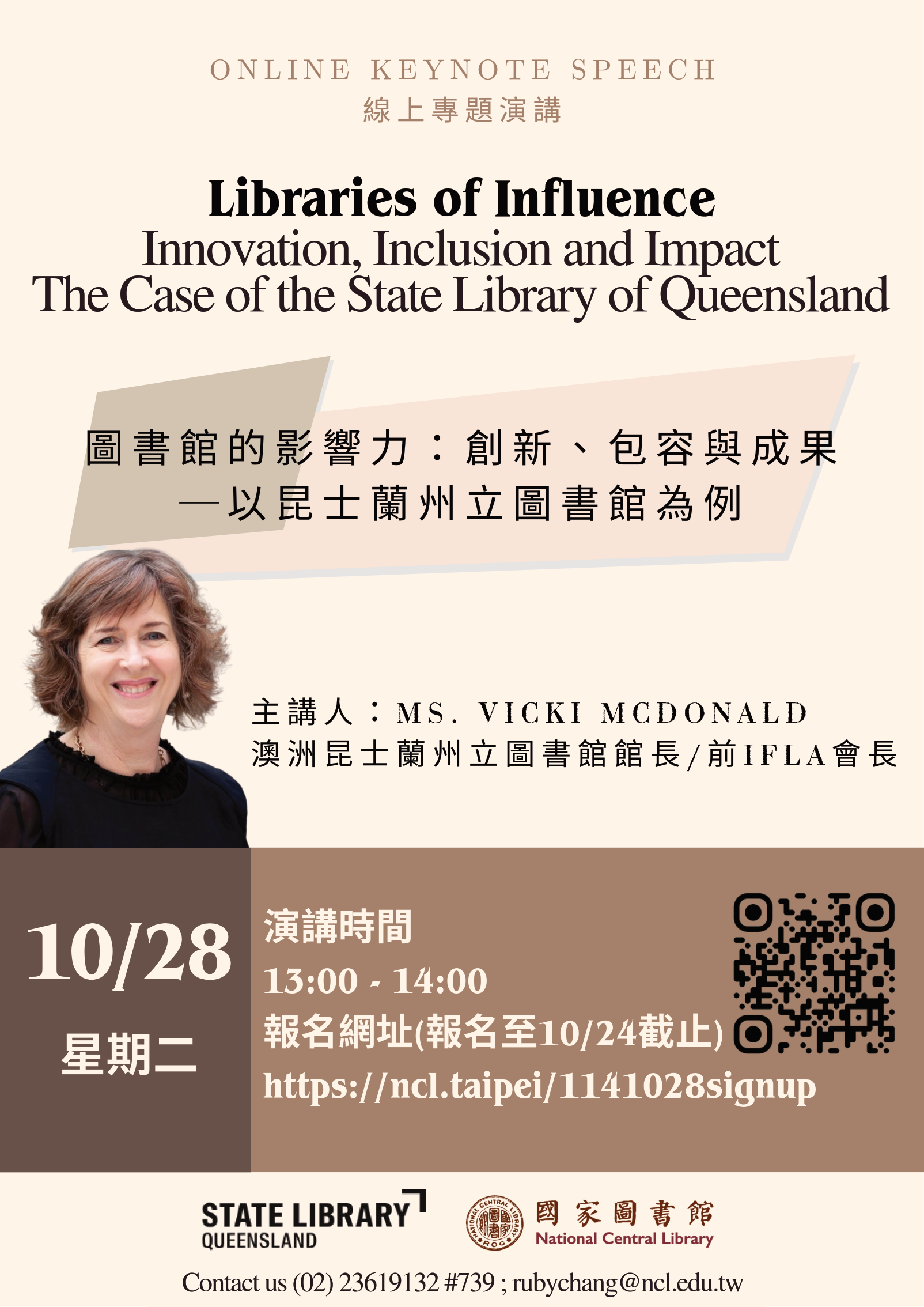 [校外訊息公告] 國家圖書館線上專題演講:「圖書館的影響力:創新、包容與成果─以昆士蘭州立圖書館為例」