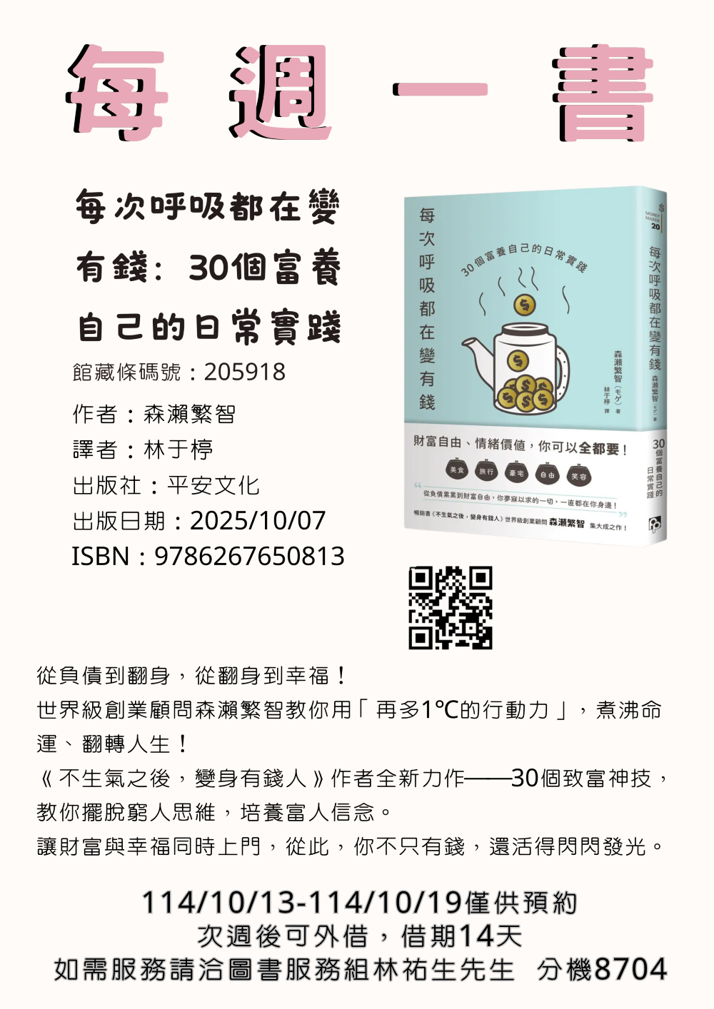 [圖資處公告] 每週一書 每次呼吸都在變有錢:30個富養自己的日常實踐