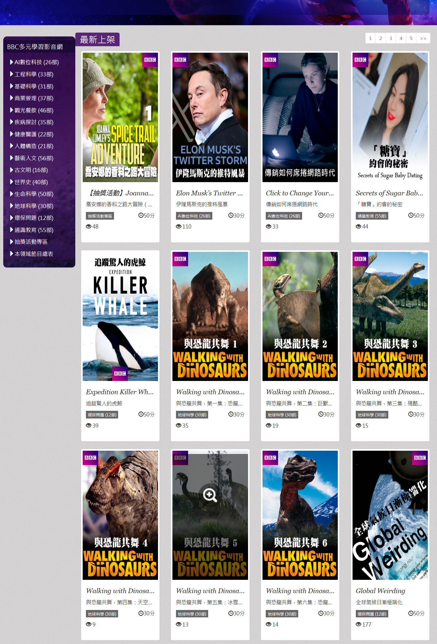 - 類別齊全,片源充足:專案規劃精選符合多元學習的影音資源。