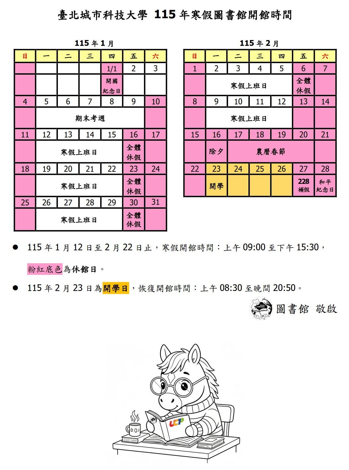 [圖書館公告] 115年寒假開館時間